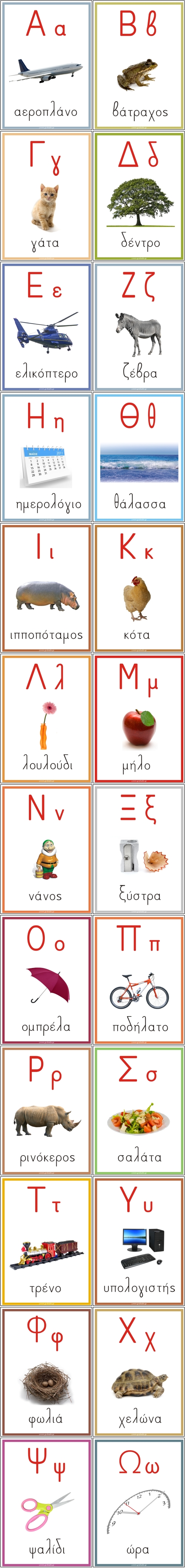 Χαρακτηριστικά: Είκοσι τέσσερις (24) αφίσες για τα Γράμματα της Αλφαβήτας στο μάθημα της Γλώσσας σε διάσταση σελίδας Α4, δηλαδή περίπου 21 επί 30 εκατοστά η κάθε μία. Με υπέροχες εικόνες που μπορούν εύκολα να αντιληφθούν και να θυμούνται τα παιδιά. Περιλαμβάνονται το μεγάλο γράμμα, το μικρό γράμμα, εικόνα, η λέξη της εικόνας.