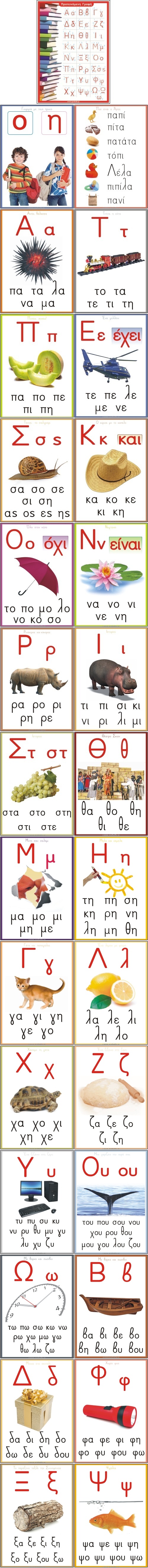 Εκπαιδευτικές Αφίσες. Μια εικόνα αξίζει όσο χίλιες λέξεις. Τα γράμματα όλα. Για το Πρώτο Μέρος της Γλώσσας. Το γράμμα της ημέρας, η πρότυπη λέξη, μαζί με τις συλλαβές με όλα τα γράμματα που έχει μάθει ως τότε το παιδί. Ειδικά κατασκευασμένες για την Πρώτη ανάγνωση, για καθημερινή εξάσκηση αλλά κυρίως για επαναλήψεις. Σε εξαιρετική εκτύπωση, με υπέροχα χρώματα και πολύχρωμες φωτογραφίες που θα εντυπωσιάσουν τα παιδιά.